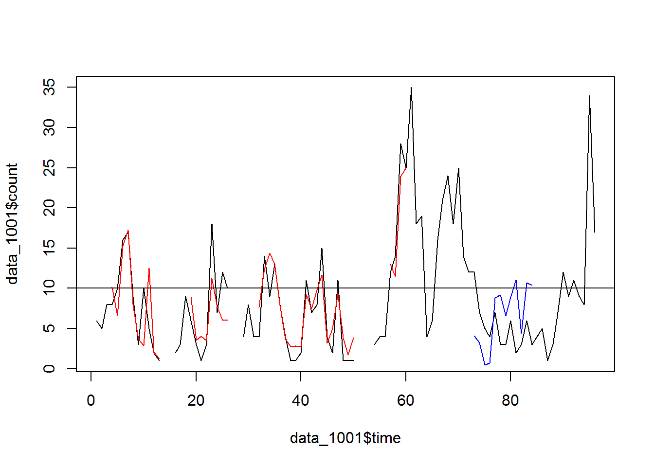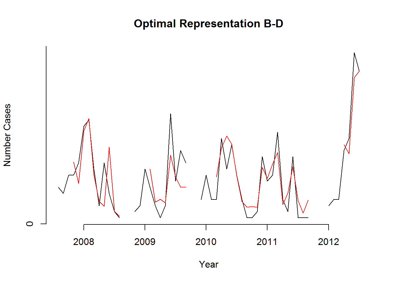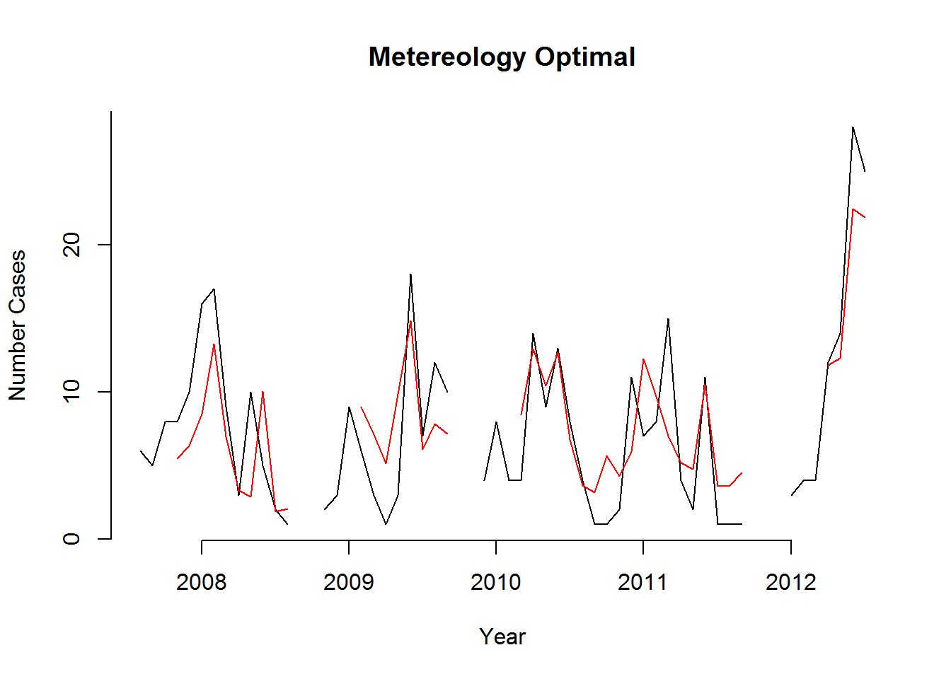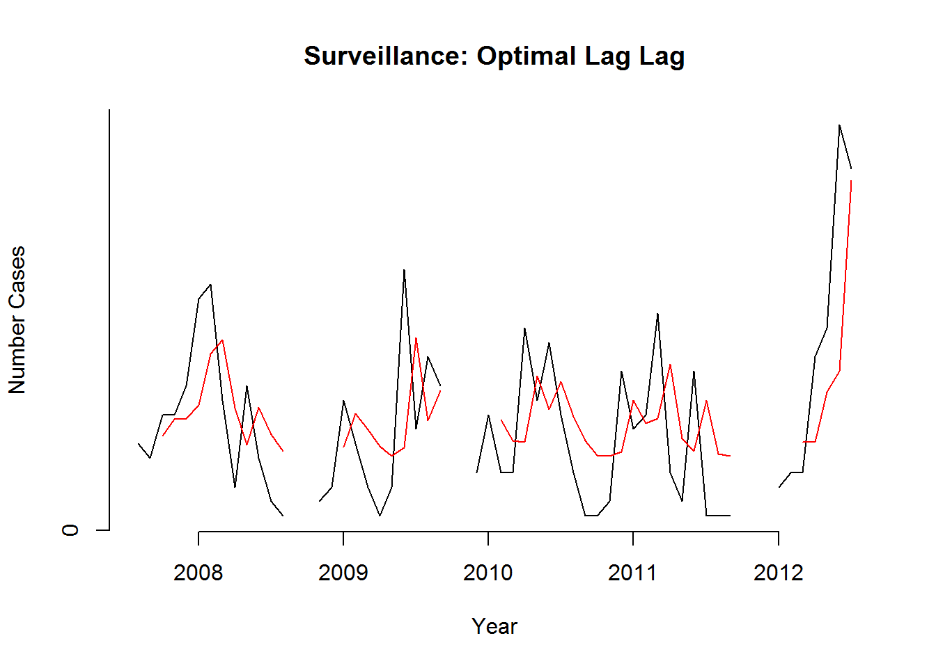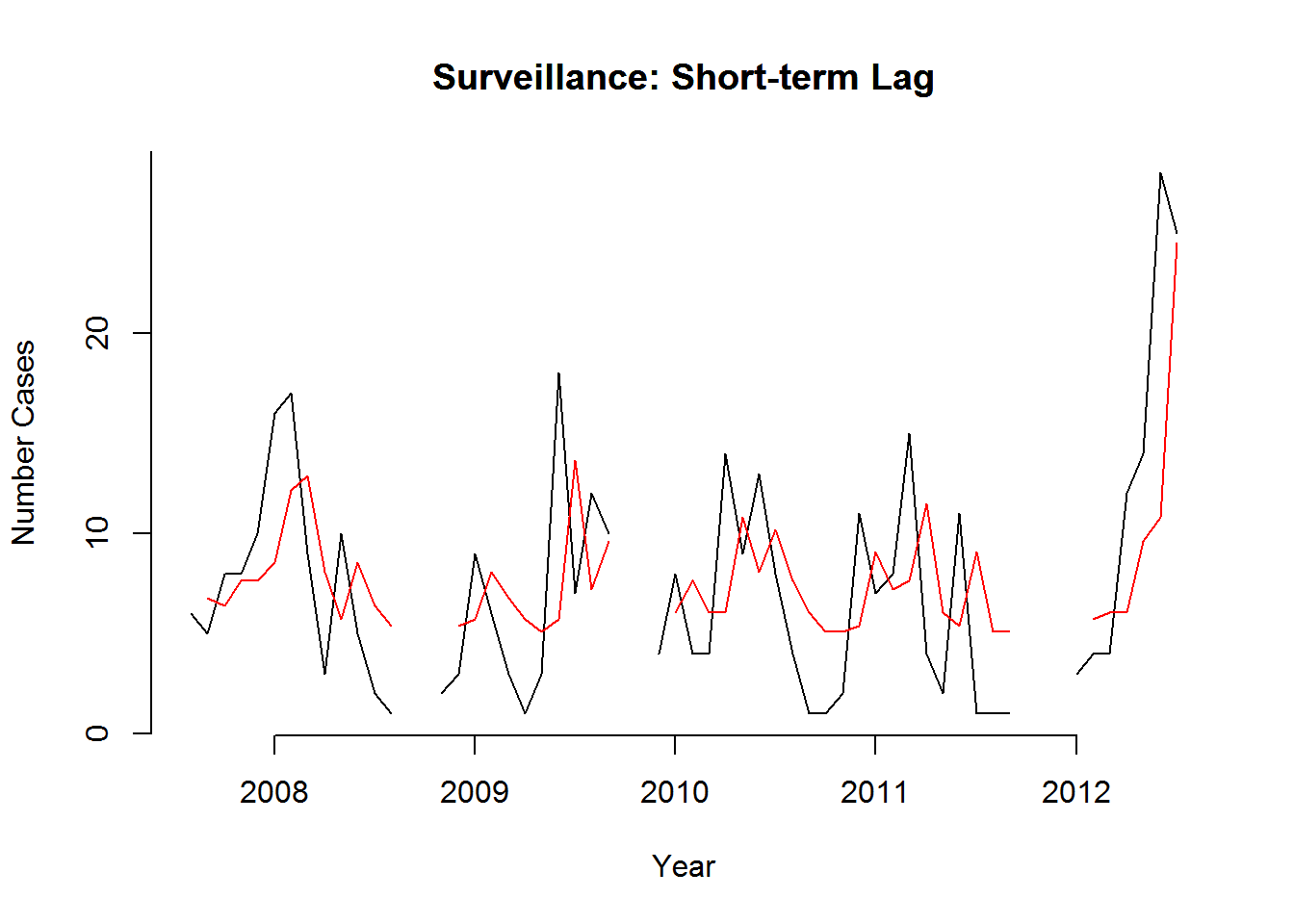 We can see from this time series that there seems to be seasonal variation in the number of dengue incidences per month: there is a peak every winter, and a trough every summer. Again, it seems that this time series could probably be described using an additive model, as the seasonal fluctuations are roughly constant in size over time and do not seem to depend on the level of the time series, and the random fluctuations also seem to be roughly constant in size over time.