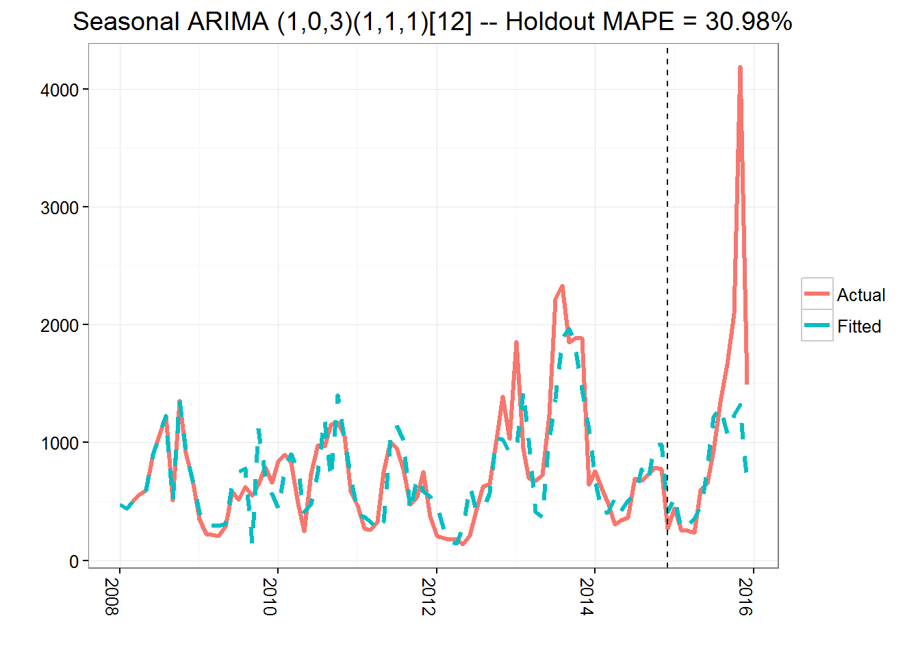I fit an ARIMA(1,0,3)(1,1,1)[12] model.