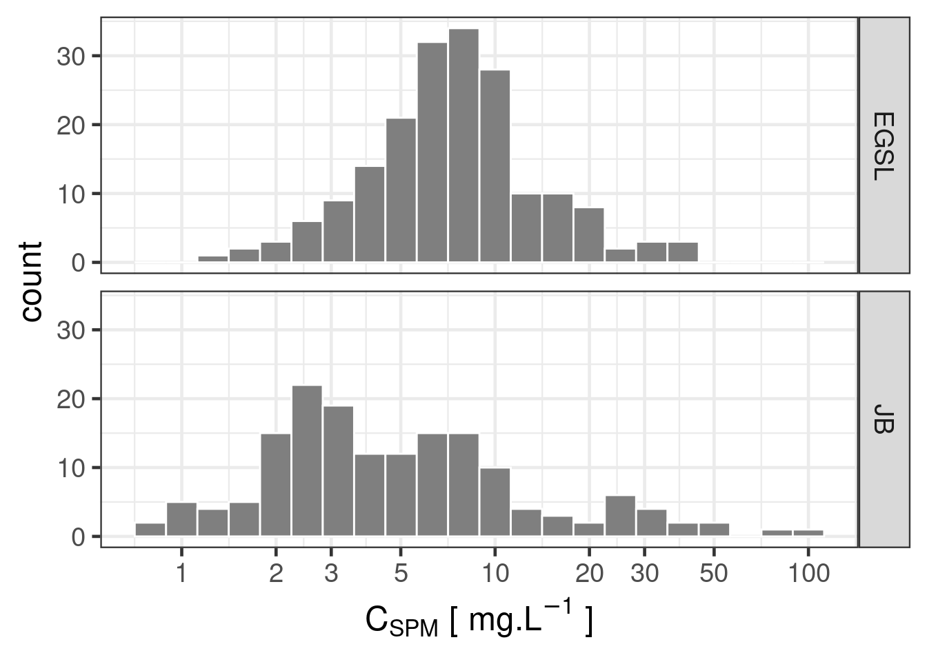 Resuspension may be attributed to shallow water waves, \(Depth <= \frac{\lambda_{wave}}{2}\) which would explain highest Cspm measured in shallow waters. This is particularly clear for the shallow waters of Jame Bay. Data on wave and/or wind speed and direction would be necessary to dig this.