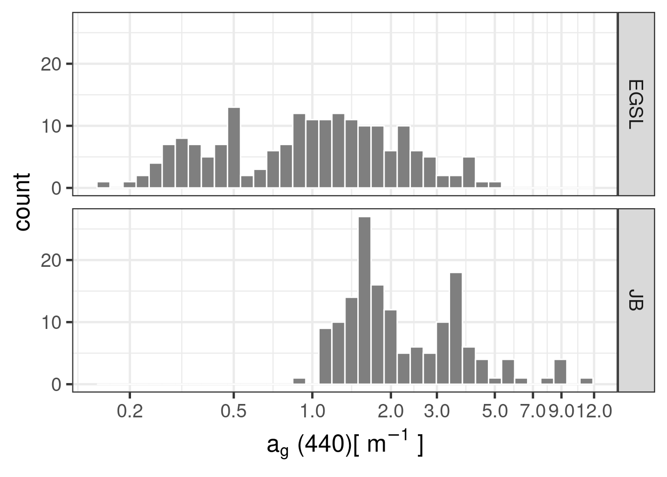 Absorption by CDOM at 440 nm (\(a_g(440)\), g for gelbstoff from German “yellow substance”) is used as a proxy for CDOM concentration