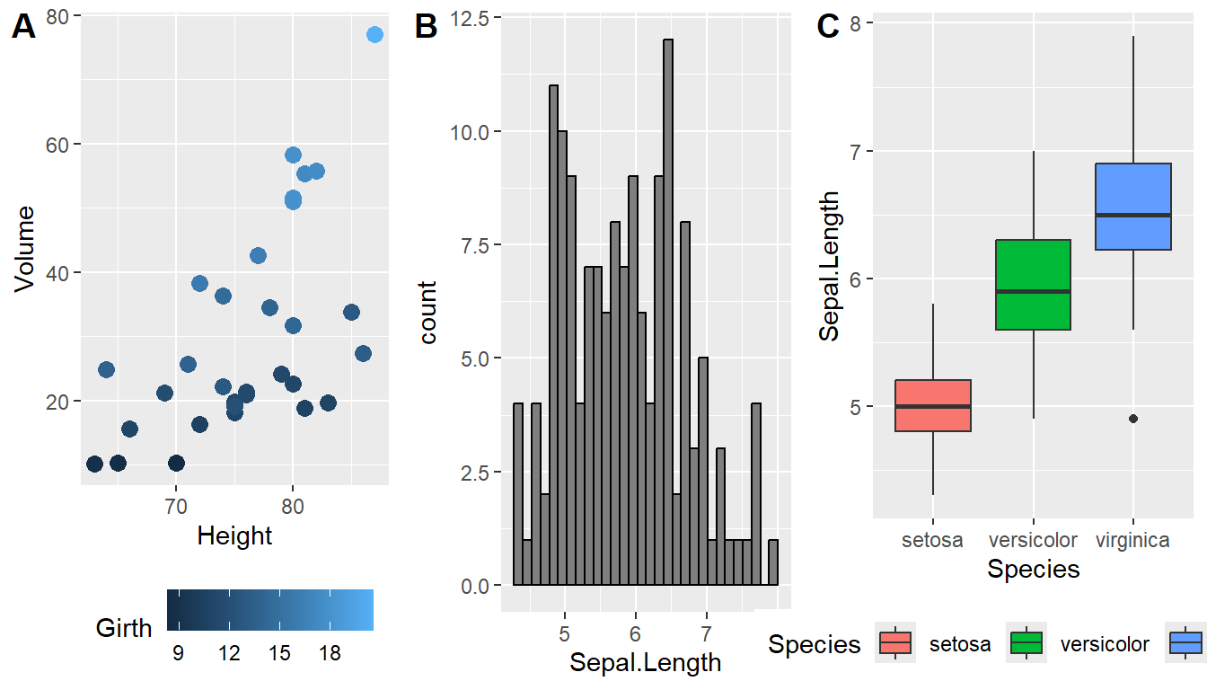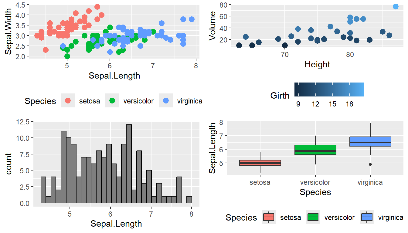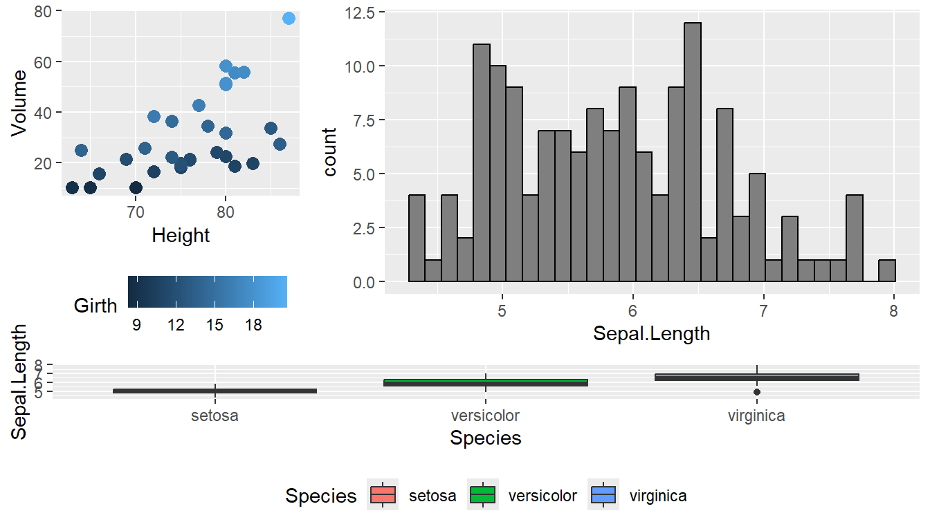 Claus O. Wilke wrote a lovely book about data visualization and also wrote an R package to help him tweak his plots. One of the functions in his cowplot package is called plot_grid() and it takes in any number of plots and lays them out on a grid. Below we use the iris and trees data sets to create several visualizations of different types. Notice that the graphs are stored to objects for further use. Once we have all information prepared in the manner we would like to display it, we arrange these graphs together as a single output using the plot_grid() function.