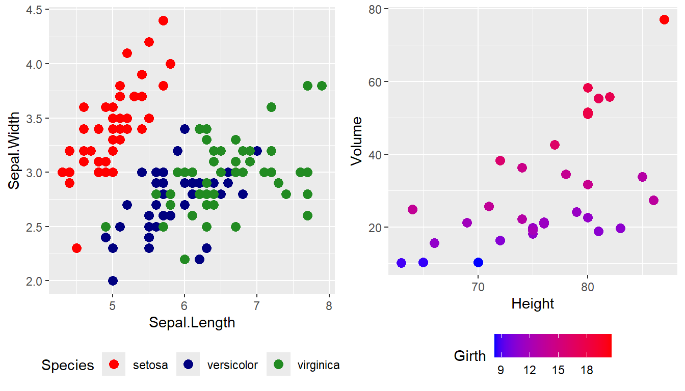 Notice that when we used scale_color_manual, we were required to provide a color argument for each species of iris. Similarly, when we used scale_color_gradient, which works with a continuous number scale, we provide a low scale value and high scale value, where a blue to red gradient was then produced. For continuous scales for fill and color, there is also a scale_XXX_gradient2() function which results in a divergent scale where you set the low and high values as well as the midpoint color and value. There is also a scale_XXX_grandientn() function that allows you to set as many colors as you like to move between. Here is an example of gradient2 and gradient.
