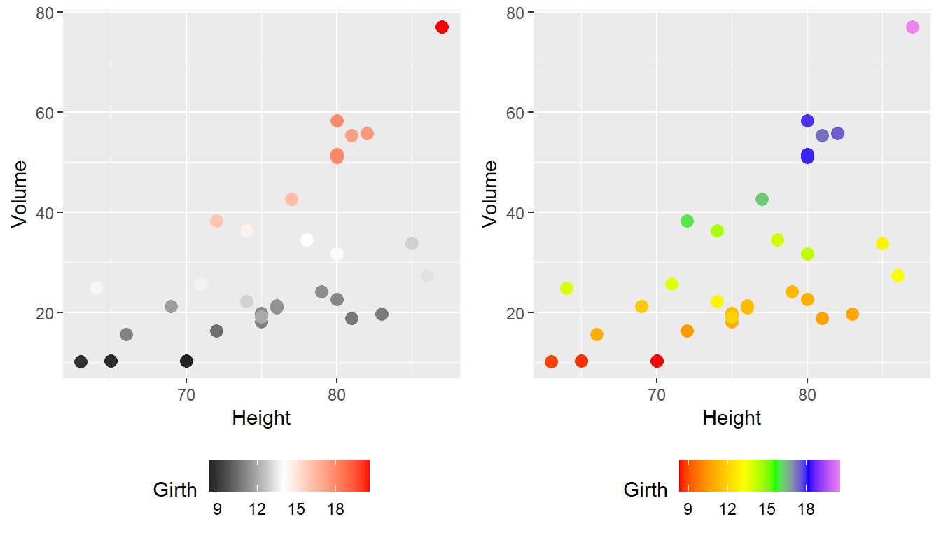 P2 <- ggplot(trees, aes(x=Height, y=Volume, color=Girth)) +