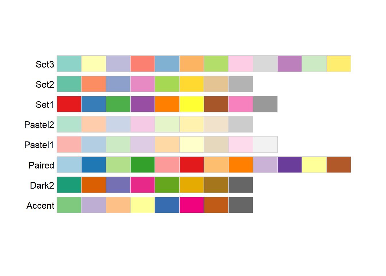 Generally I find that I make poor choices when picking colors manually, and luckily R provides a large number of different color palettes for those of us who are not so color-inclined.