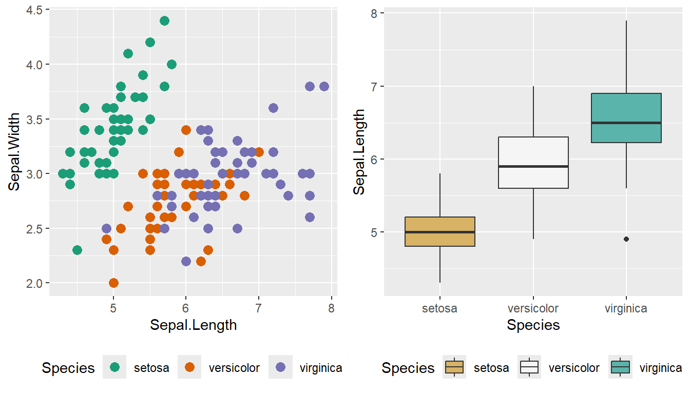 Using the ggplot::scale_XXX_brewer() functions, we can easily work with the package RColorBrewer which provides a nice set of color palettes. These palettes are separated by purpose.