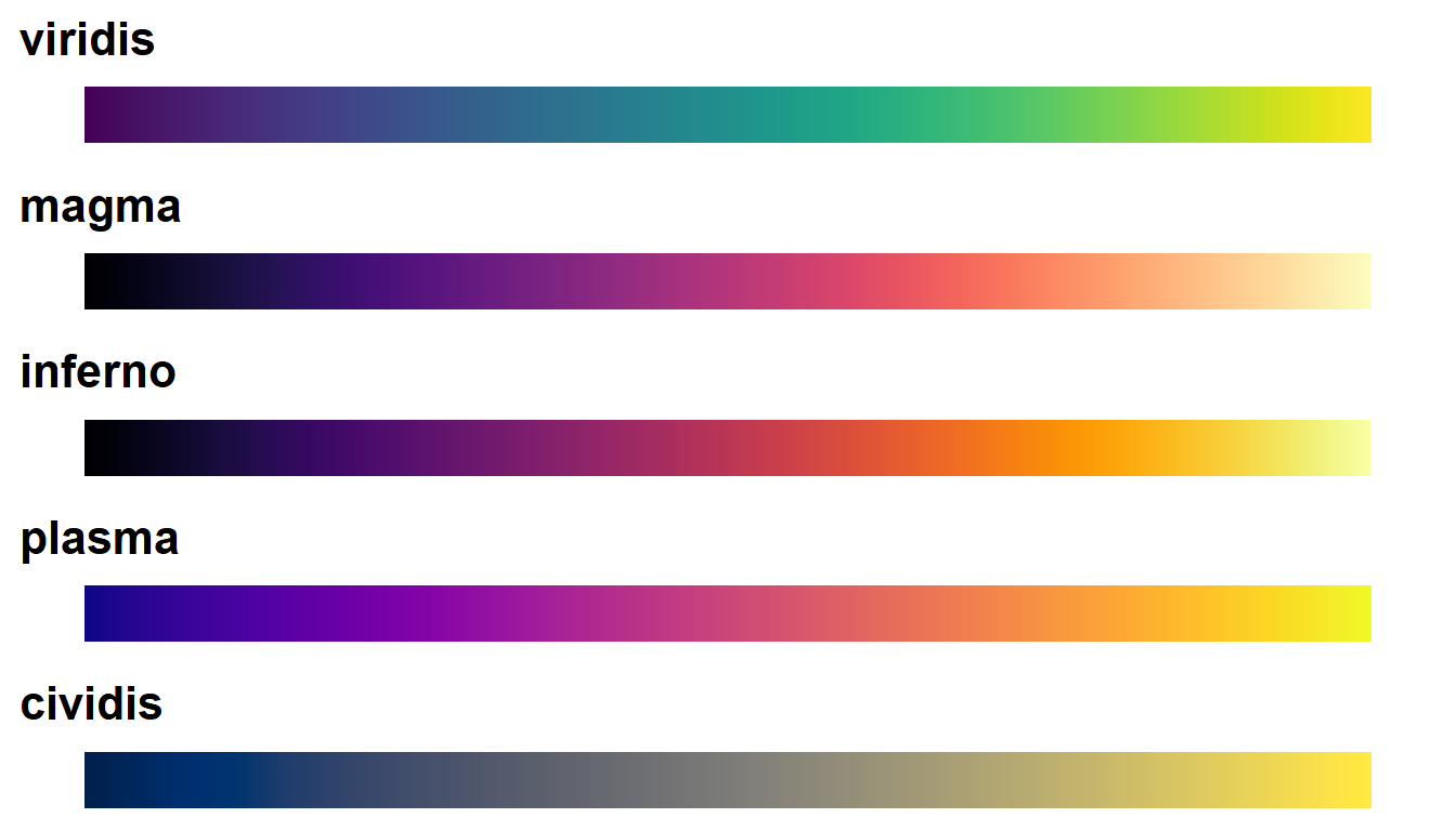 library(viridis) # The viridis color schemes