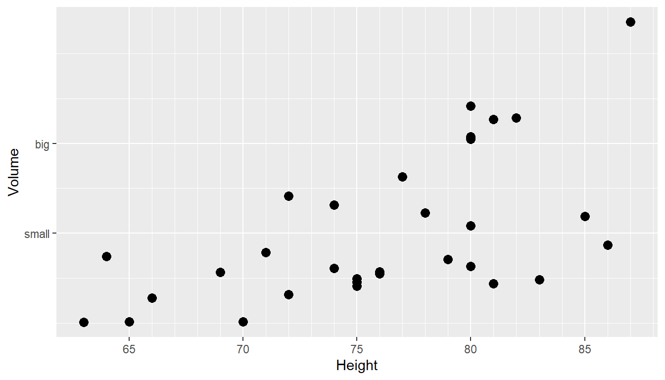 ggplot(trees, aes(x=Height, y=Volume)) + geom_point(size = 3) +