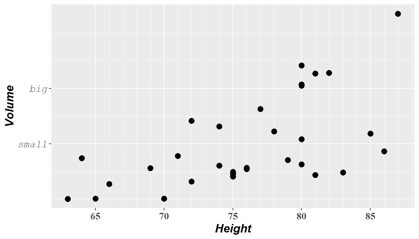 A very common task to improving graphs is the readability of our axes, which can be modified by changing the text size, font, and style. These can be added within the theme() command to add axis.text and axis.title arguments, which take on the element_text command for augmenting the text output. Each element text can take on their own size, face, and family (font), allowing for customization of text output, most importantly ensuring readability and accessibility. Axis text refers to the labels of the tick marks, while axis title refers to the labels given to each axes (below, Height and Volume).