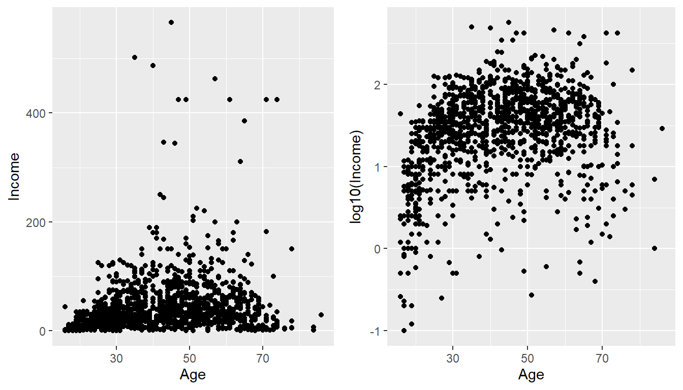 Plotting the raw data results in an ugly graph because six observations dominate the graph and the bulk of the data (income < \(\$100,000\)) is squished together. One solution is to plot income on the \(\log_{10}\) scale. Lets plot the log10 data next to the original graph using a plot_grid() for easy comparison.