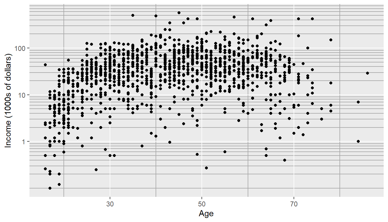 Although our changes to the log-scale worked well to see the trend of peak earning happening in a persons 40s and 50s, the scale is difficult for me to understand (what does \(\log_{10}\left(X\right)=1\) mean here? Oh right, that is \(10^{1}=X\) so that is the \(\$10,000\) line). It would be really nice if we could do the transformation but have the labels on the original scale. Rather than changing the data, which was done in the above graph, we can use the scale_y_log10() function within our ggplot structure. This will create a graph on the log-scale, but retain the original data values. The theme() command and its options will be discussed in more detail below, but to accentuate how the log scaling works, darker minor tick colors were added.