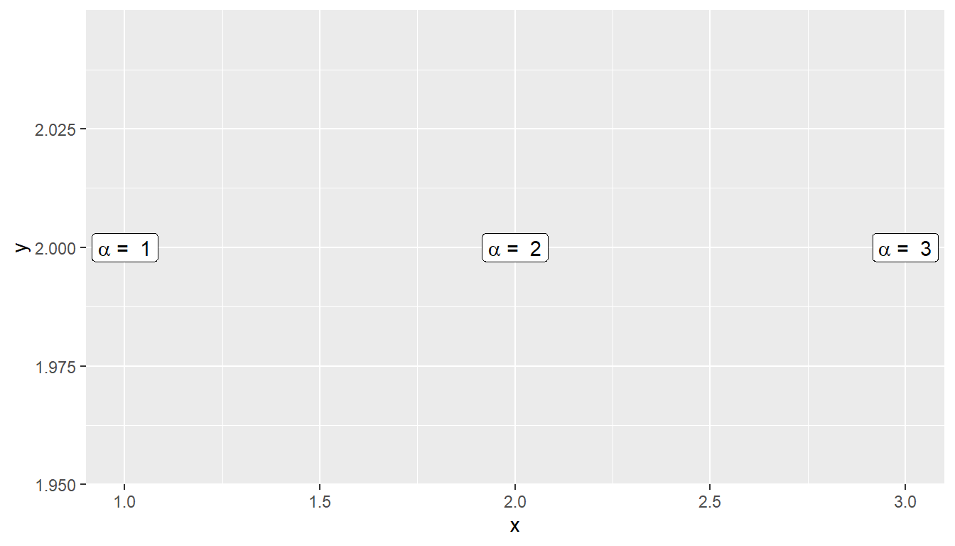 Another issue is how to add expression to a data frame. Unfortunately, neither data.frame nor tibble will allow a column of expressions, so instead we have store it as a character string and then introduce the conversion to LaTeX. Below creates three character strings using standard LaTeX syntax, and then converts the character string that represents the R expression. Finally, in ggplot, we tell the geom_text layer to parse the label and interpret it as an R expression. This is a bit of an advanced topic, but can be very useful if you want to add many LaTeX expressions to a graph.