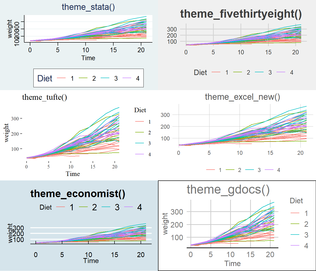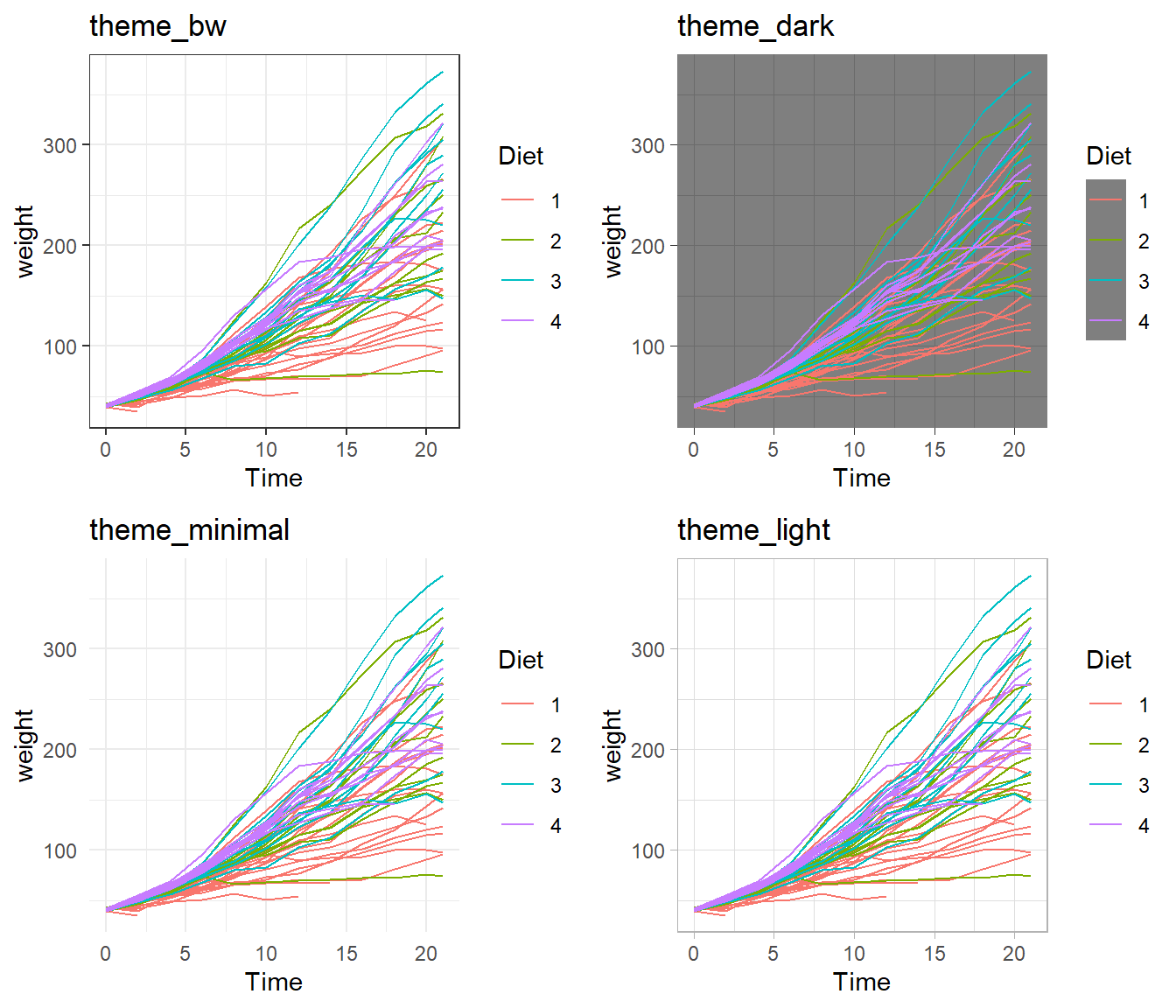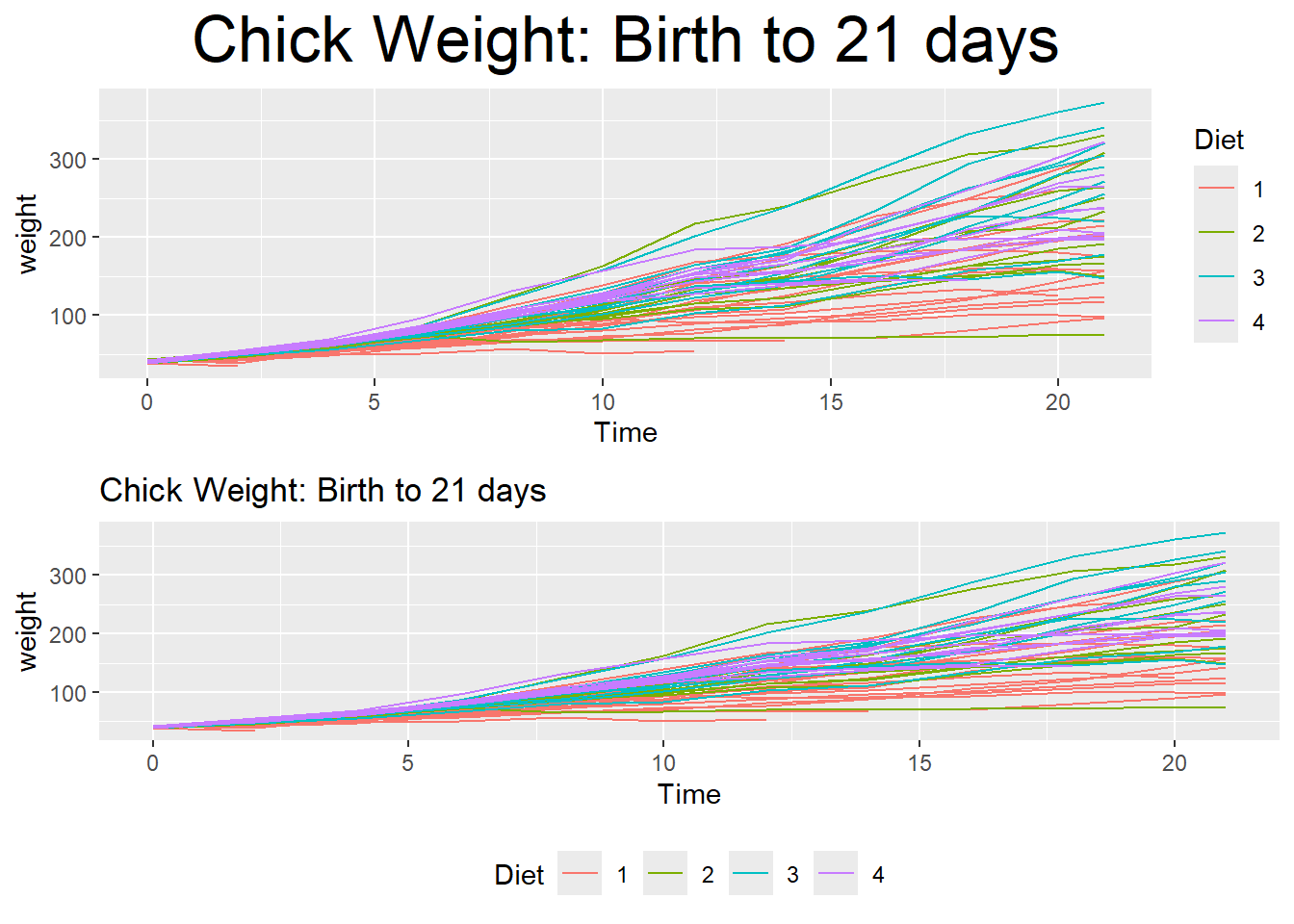 p1 <- ggplot(ChickWeight, aes(x=Time, y=weight, colour=Diet, group=Chick)) +