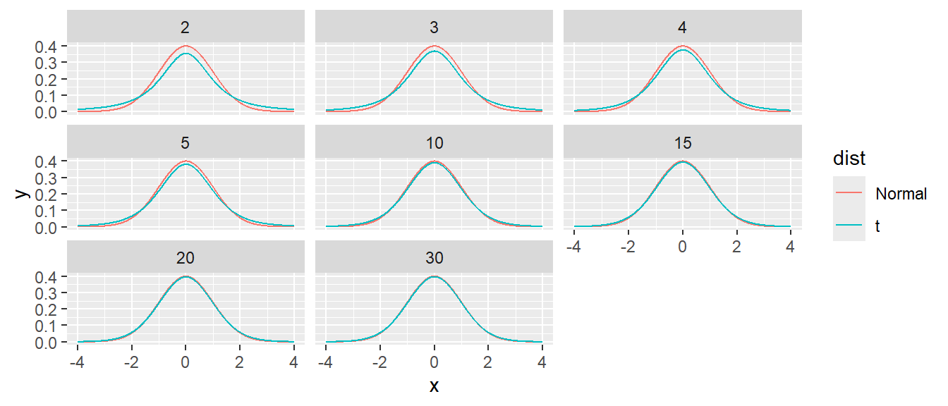 A fun example of using this function is making several graphs of the standard normal distribution versus the t-distribution. Use the expand.grid function to create a data.frame with all combinations of x=seq(-4,4,by=.01), dist=c('Normal','t'), and df=c(2,3,4,5,10,15,20,30). Use the dplyr::mutate command with the if_else command to generate the function heights y using either dt(x,df) or dnorm(x) depending on what is in the distribution column.