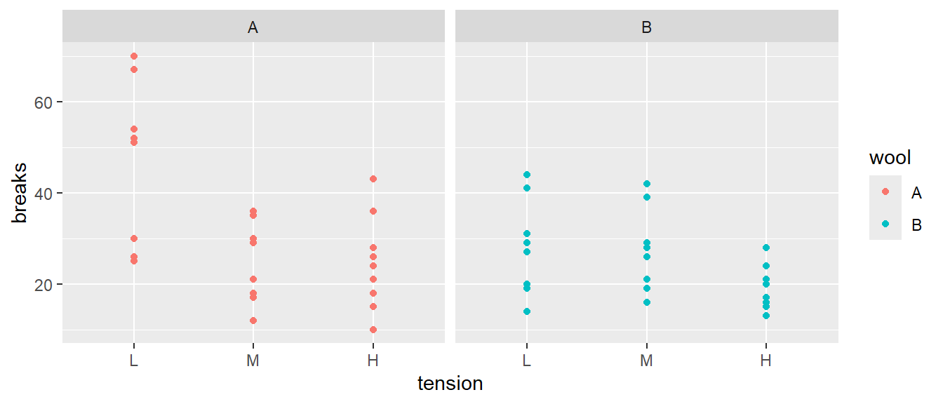 Aside from unifying the syntax behind the common operations, the major strength of the dplyr package is the ability to split a data frame into a bunch of sub data frames, apply a sequence of one or more of the operations we just described, and then combine results back together. We’ll consider data from an experiment from spinning wool into yarn. This experiment considered two different types of wool (A or B) and three different levels of tension on the thread. The response variable is the number of breaks in the resulting yarn. For each of the 6 wool:tension combinations, there are 9 replicated observations.