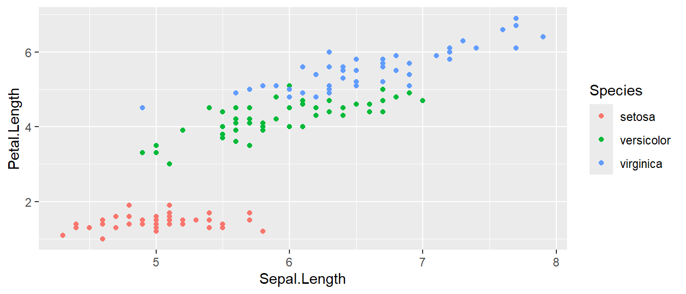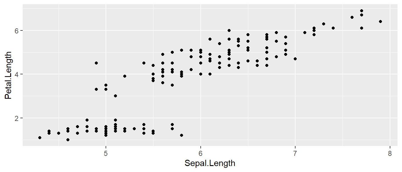 x=Sepal.Lengthandy=Petal.Length. This means the x-axis will be the Sepal Length and the y-axis will be the Petal Length. To use data directly from the initial data frame, we must always include this mapping within theaes()command. - The way we want to display this relationship is through graphing 1 point for every observation (scatter). Thus we map this information into the scatter graph geometry known as