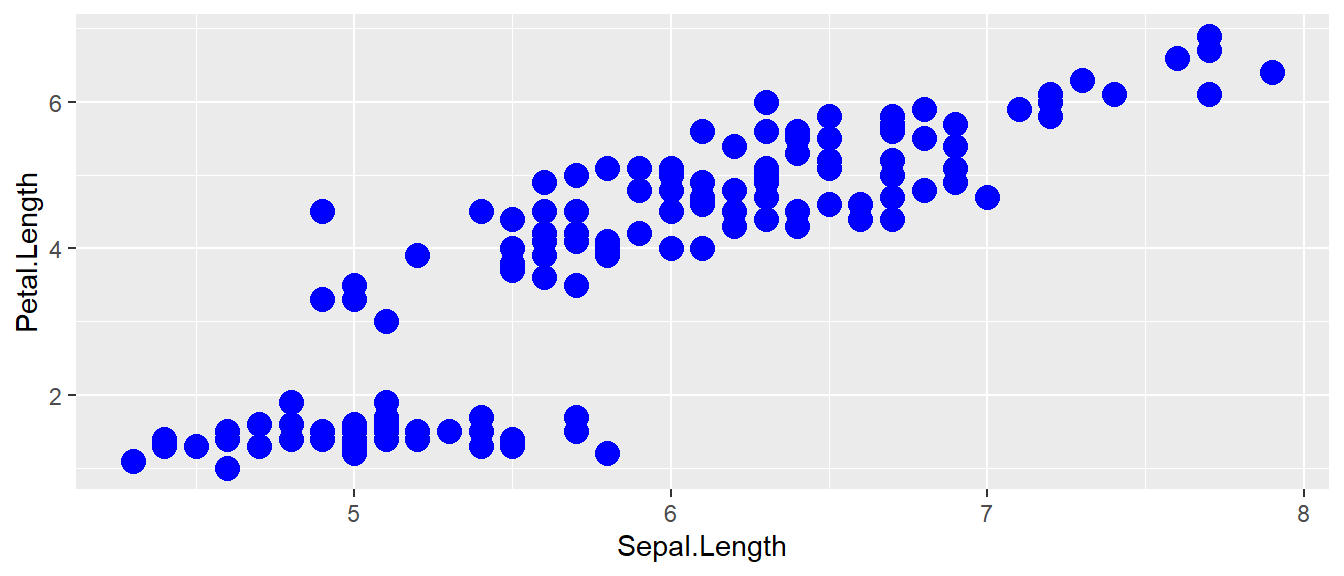 Let’s take a moment to think about the aes() command inside the previous section of code, which can be quite mysterious to new users. The way to think about the aes() is that it gives you a way to define relationships that are dependent on the data frame (here data=iris). In the previous graph, the x-value and y-value for each point was defined dynamically by the data, as was the color. If we just wanted all the data points to be colored blue and larger, then the following code would do that
