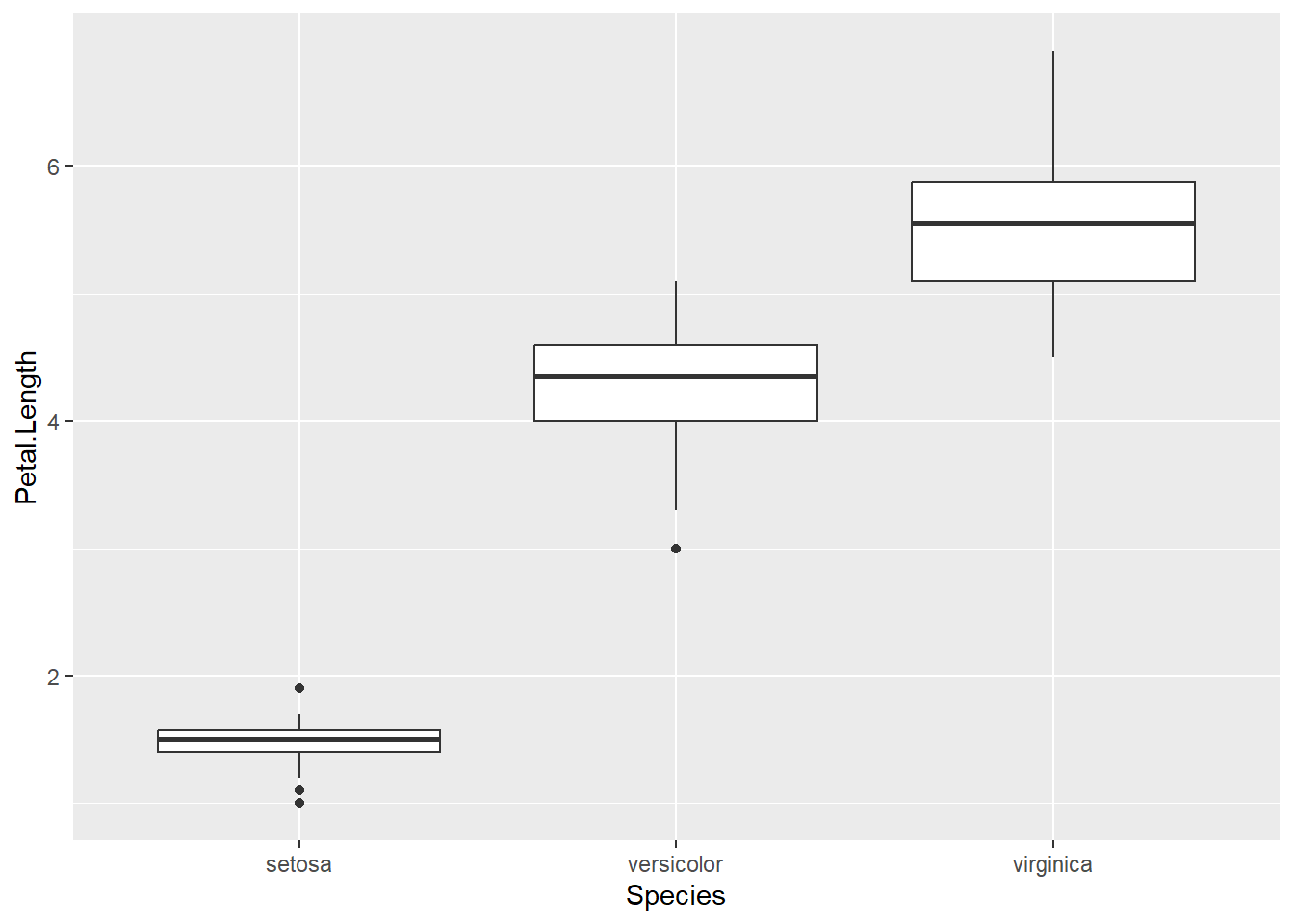 Boxplots are a common way to show a categorical variable on the x-axis and continuous on the y-axis. Lets evaluate the distribution of Petal.Length versus the Species of iris. The syntax works very similar to above, but now we will map the information into a boxplot geometry.