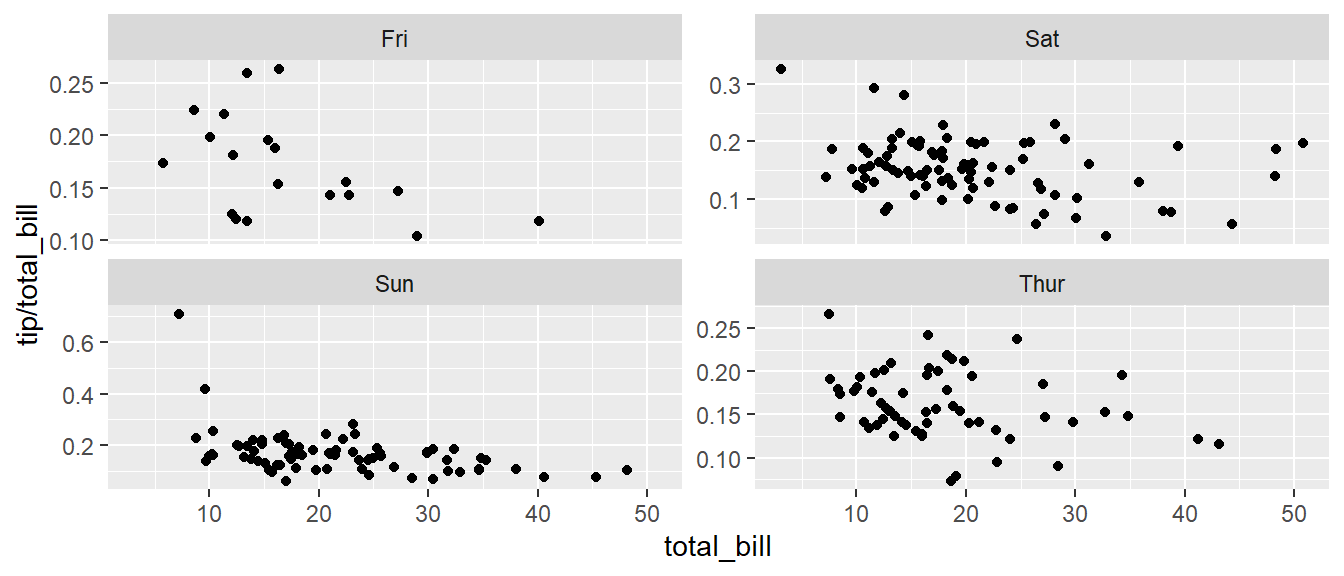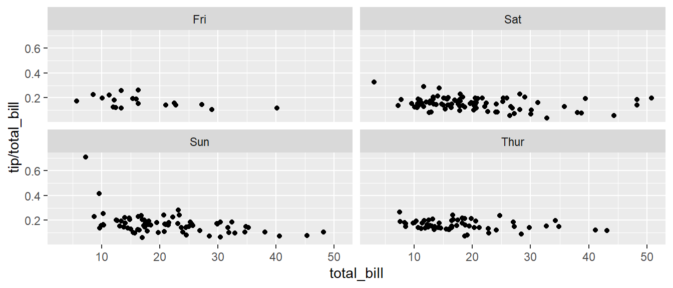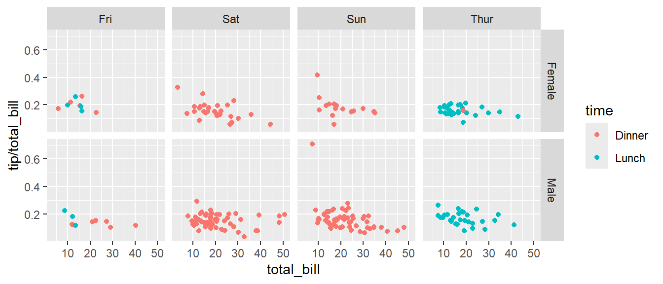 # facet_grid( day ~ sex ) # changing orientation emphasizes certain comparisons!