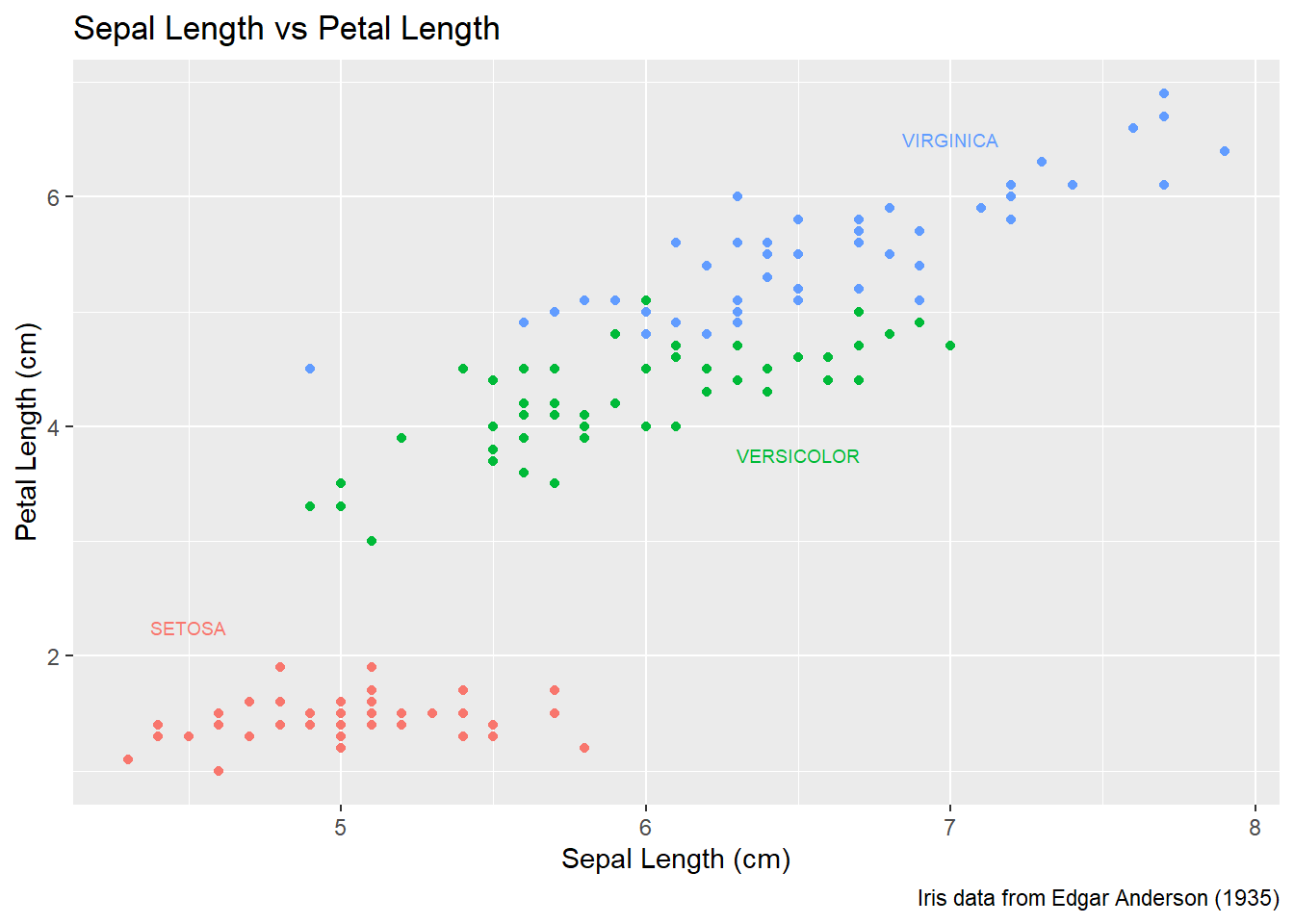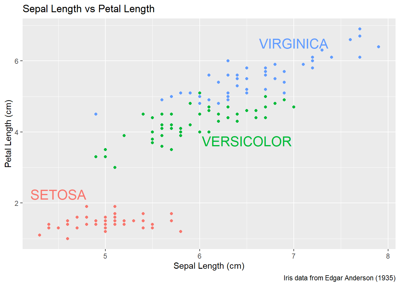 labs( x="Sepal Length (cm)", y="Petal Length (cm)" ) +
