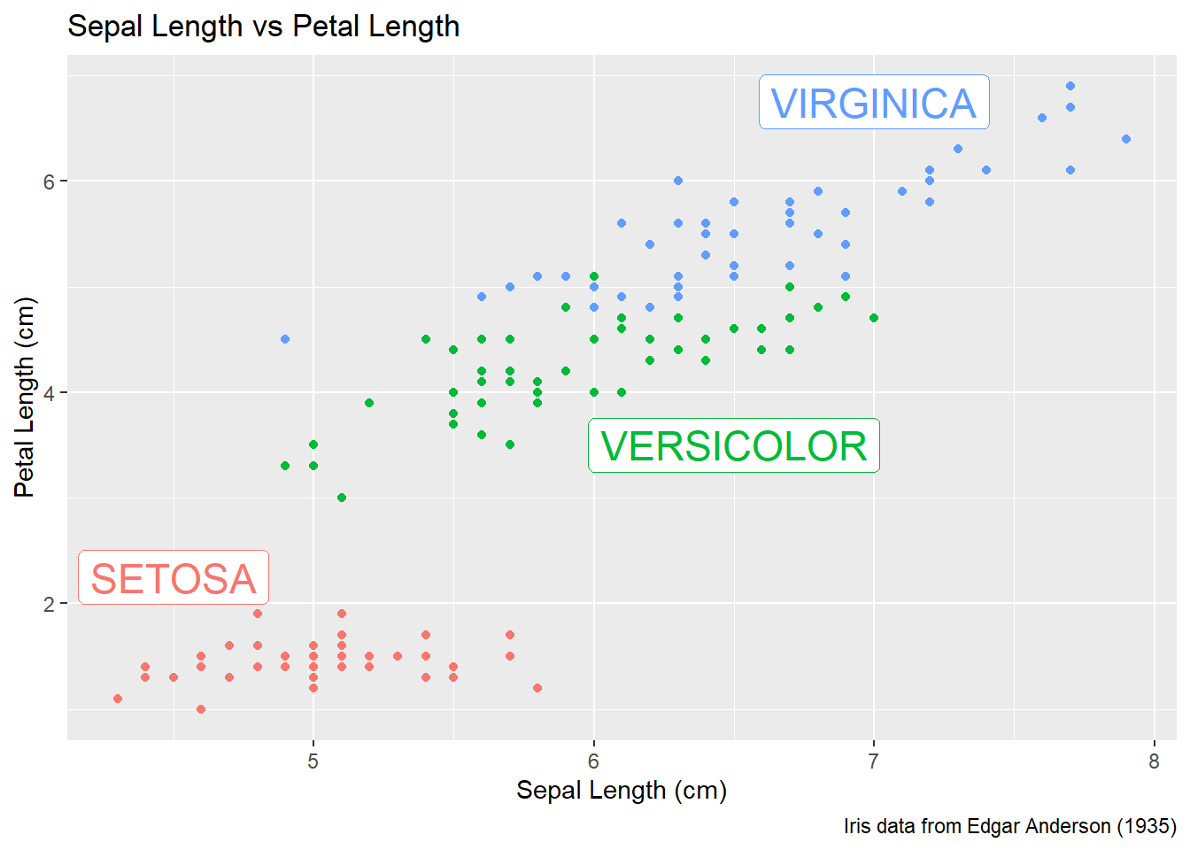 To do this in ggplot, we need to make a data frame that has the columns Sepal.Length and Petal.Length so that we can specify where each label should go, as well as the label that we want to print. This is essentially indicating where on the x-y graph the text should be located. Also, because color is matched to the Species column, this small data set should also have a the Species column.
