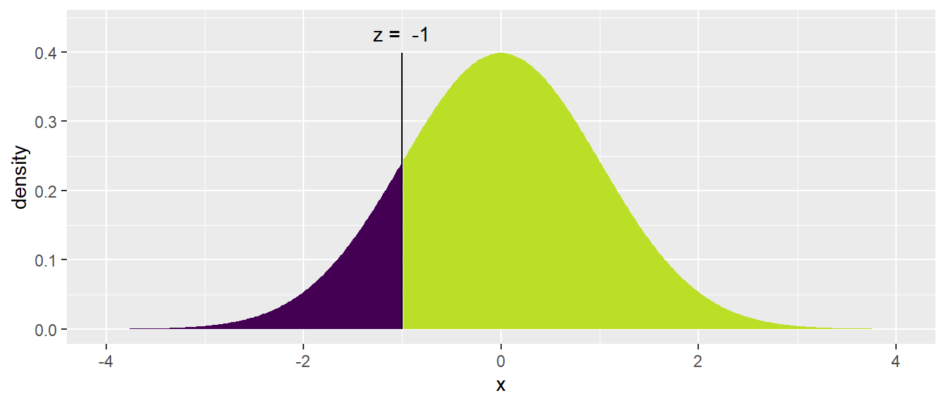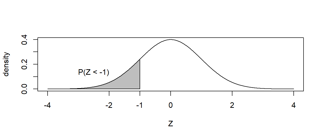 Notice for continuous random variables, the probability \(P\left(Z=-1\right)=0\) so we can ignore the issue of “less than” vs “less than or equal to”. That is, for a continuous distribution \(P(Z < -1) = P(Z \leq -1)\). These are important concepts frequently covered when studying distributional theory and differentiation of discrete vs. continuous distributions!