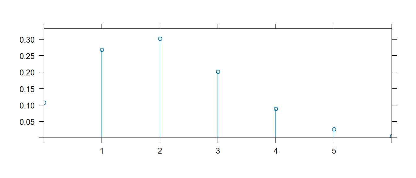 b) Calculate the probability that a Poisson random variable (with rate parameter \(\lambda=2\)) is exactly equal to 3 using the dpois() function. Be sure that this value matches the graphed distribution in part (a).