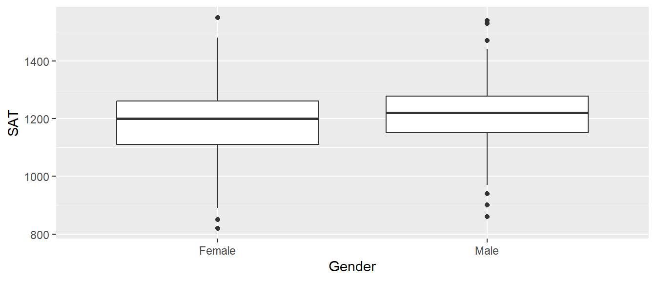 You can see that using vectors produces the same output as the formula notation. It is important to note that the order in which the vectors are given matters, and switch the order will change the sign of many of the estimates, but not the results/conclusions of the test. The order for using formula notation is inherent to the ordering of the explanatory variable, which by default for characters is set to alphabetical order. This made the formula notation t-test use Female as the reference group, and thus for the above vector-based answer, I placed the Female SAT score first, so that the answers would agree. Vector notation is also important to learn as there are some cases, such as the paired t-tests introduced below, that don’t have a ‘nice’ way to write a simple formula to conduct the test.