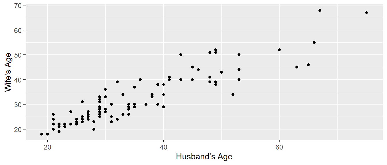 geom_point() + labs(x="Husband's Age", y="Wife's Age")
