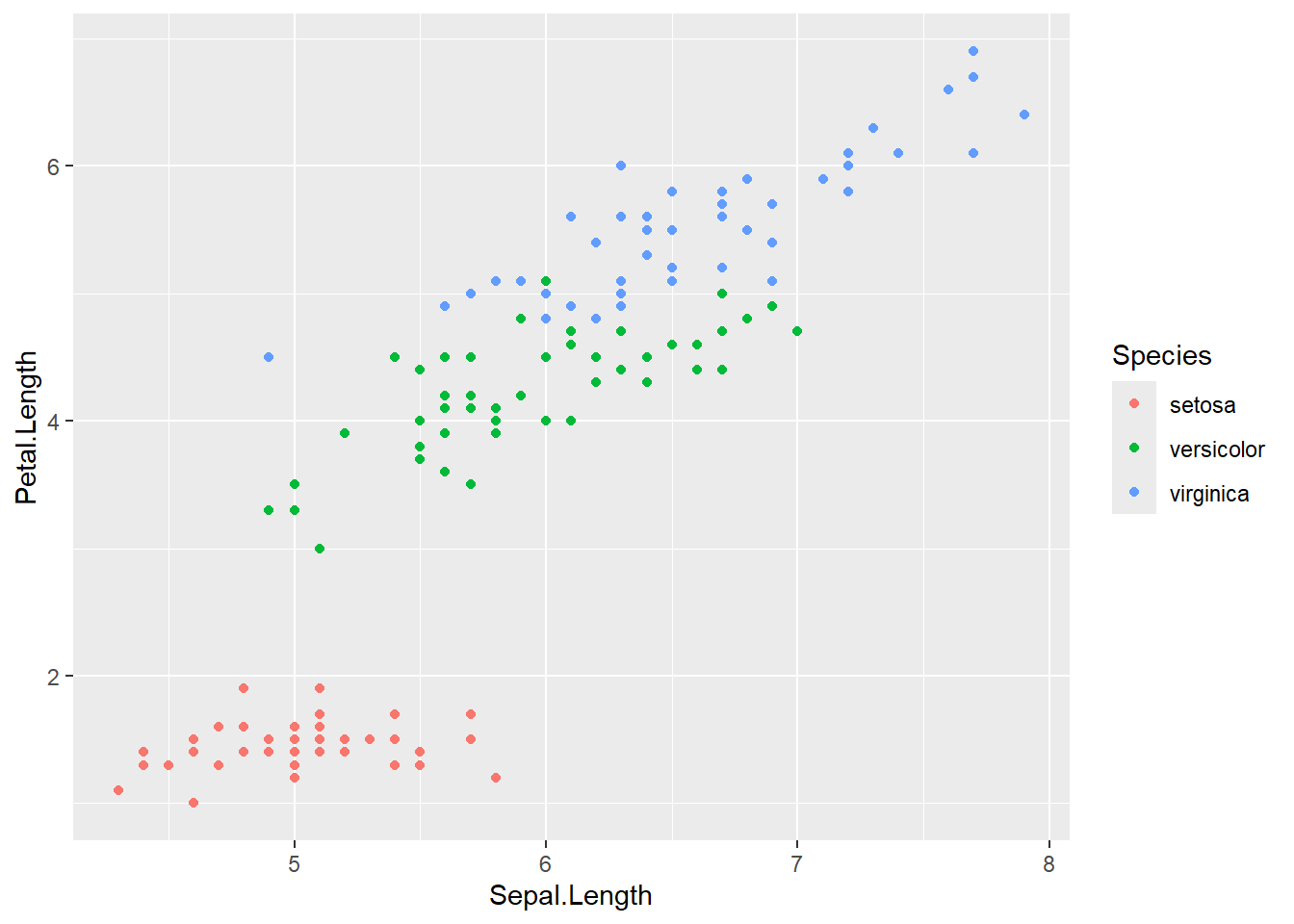 ggplot(iris, aes(x=Sepal.Length, y=Petal.Length, color=Species)) +