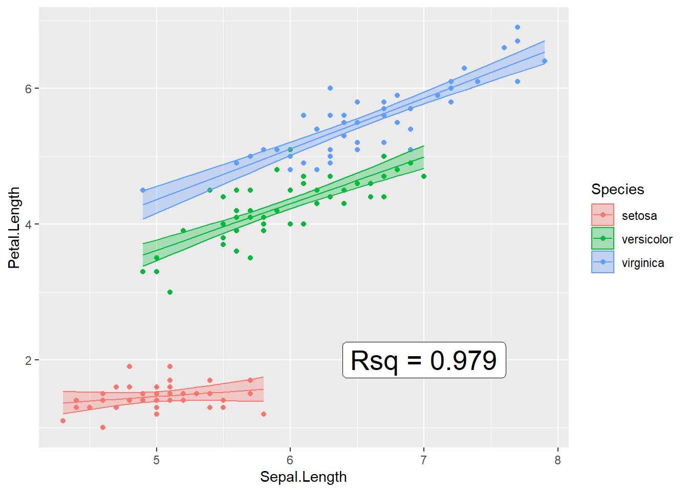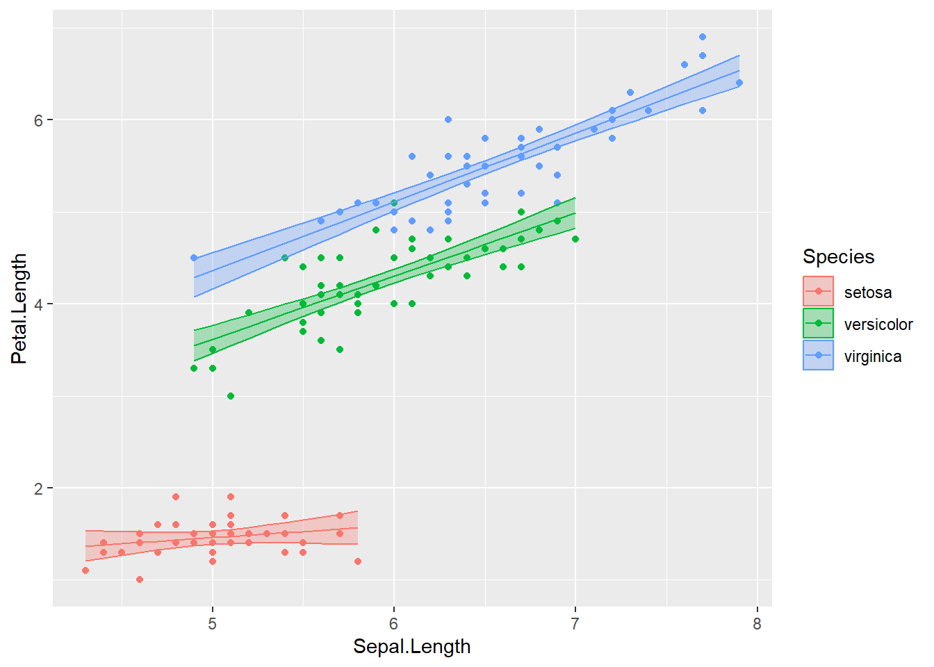 Now that the fitted values that define the regression lines and the associated confidence interval band information have been added to the iris data set, we can now plot the raw data and the regression model predictions.