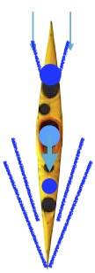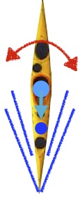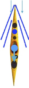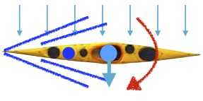 The wind force acts all along the side of the boat (light blue arrows). In most sea kayaks, the side area exposed to the wind is fairly balanced front to back. The net effect is as if all the wind force were acting at a ‘center of pressure’ (light blue dot and thick arrow) around the middle of the boat