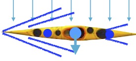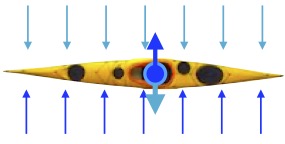 As the boat starts to move sideways across the water, the hull of the kayak will experience water resistance (dark blue arrows). Like the wind force, this acts all along the boat. Again, most kayaks are fairly balanced front to back and the center of pressure of the water resistance (dark blue dot and thick arrow) is around the middle of the boat.