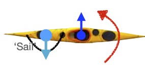 Notice that the boat’s ‘locked’ at the centre of water resistance (dark blue dot), with the centre of wind pressure (likely mostly due to the paddler’s body) behind it. Like a pendulum hanging vertically, having the wind force acting behind the water resistance is a stable configuration. Whilst it’s hard work to paddle upwind (you’re fighting both the water resistance and the wind), the boat will tend to go in a straight line.
