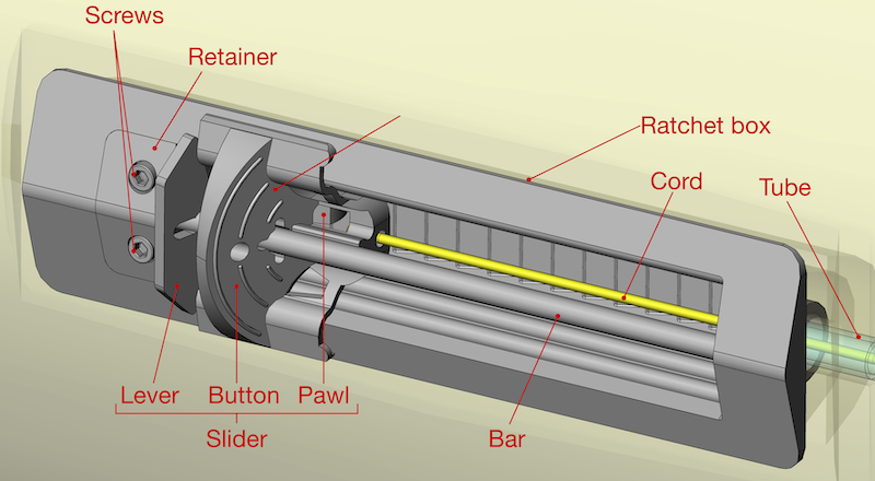 The bottom of the ratchet box has a ratchet surface, with a number of grooves. The pawl engages with one of these grooves under the action of a spring (not shown), preventing the slider moving under the tension in the cord (to the right in the image above). Because of the way that the ratchet surface is shaped, when the slider is pushed to the left, the pawl rides over the grooves, allowing movement. However, no movement is possible to the right unless the pawl is raised by squeezing the lever to the button.