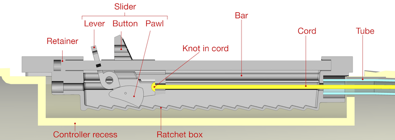 The ratchet box is bonded into the controller recess in the boat. A composite bar runs the length of the box, being retained at one end by a hole in the ratchet box and at the other end by the retainer. The retainer is held in place with screws. The slider runs along the bar. It consists of the button, the lever and the pawl. The cord is retained in the button with a knot.