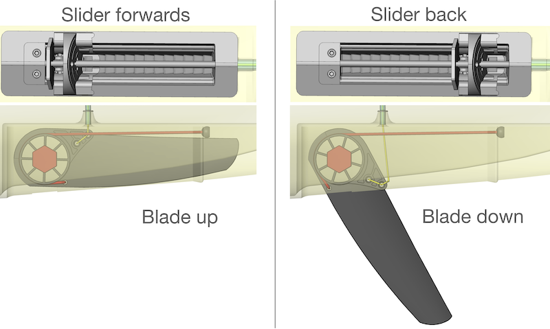 The actuator subsystem. Within the skeg box, the blade is pulled down by elastic and raised by the cord.