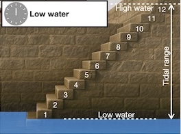 Low water today is at 12:00, and at low water, the water level is at the bottom of the first step. It just so happens that high water today will be at the top of step 12, 3.6 m higher. So, a twelfth of the tidal range is 3.6 m/12 = 0.3m = 30 cm = the height of one step.
