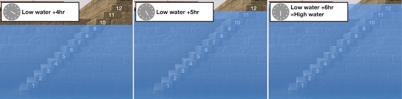 After the first hour, at 13:00, the tide has risen 1/12 of it’s range - one step.