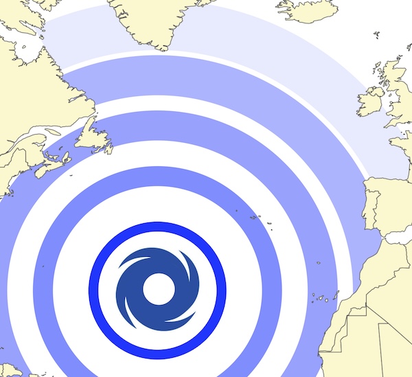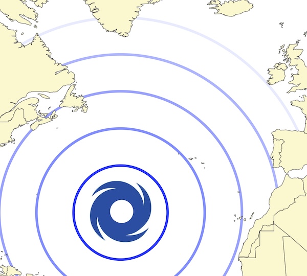 So we should really update our diagram of the North Atlantic- the energy of the waves doesn’t just spread out circumferentially - it spreads out radially in the direction of swell travel too: