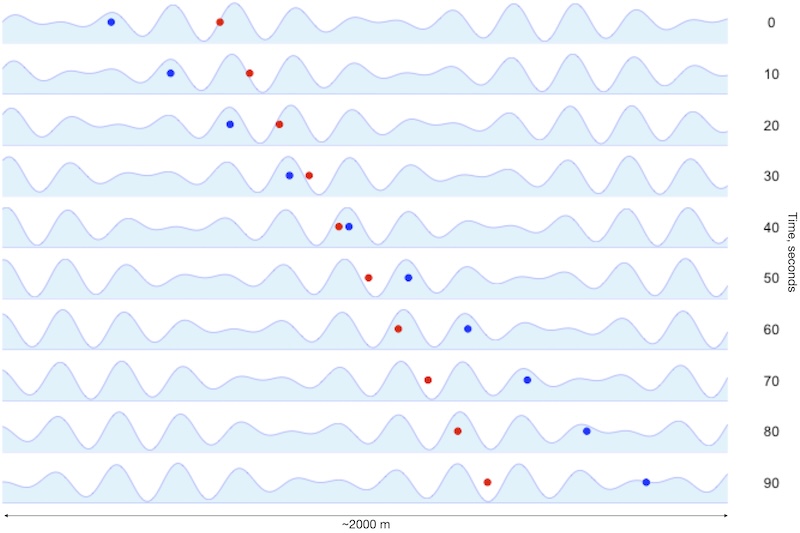 These sets have some curious behavior if we observe them over time. Here’s a few diagrams of a wavetrain with ~10 second period waves over a period of about 90 seconds: