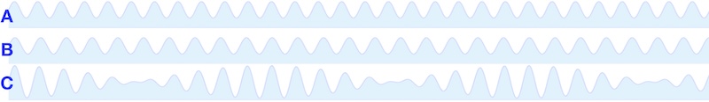 In the diagram, simple wave train A is added to simple wave train B to produce the more complex wave train C. Because A and B don’t have exactly the same period, they don’t line up perfectly. Notice how where the peaks of A and B line up, the resulting waves are large. But when a peak lines up with a trough, the waves cancel out to produce a flat area.