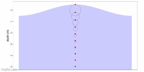 Notice that the particles follow a circular path. The circles become smaller with depth - and again, there’s almost nothing happening by the time we get to a depth equal to half the wavelength - 5 meters for this 10 meter long wave.