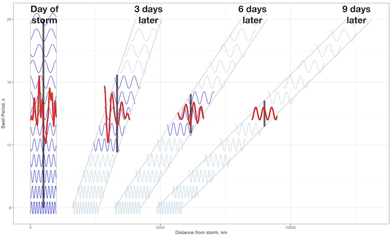 Storms create a chaotic blend of waves of different heights and wavelengths. As the waves travel away from the storm, the faster long-period waves move quicker than the slower short-period ones. It’s a bit like how runners separate out during a marathon - everyone starts clustered together, but by 20 miles in, the longer-legged runners are out in front, whilst those with shorter strides are left behind.