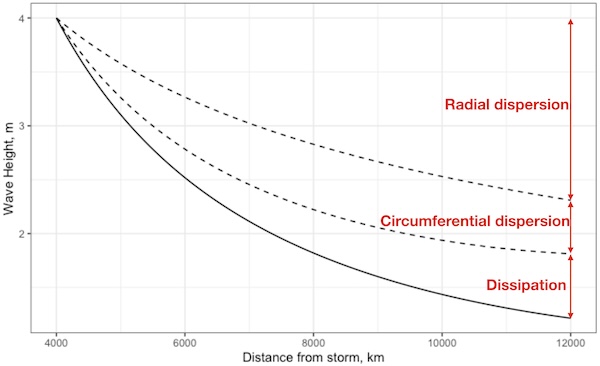 Notice how the wave height initially drops quickly, but then changes much more slowly over remarkably long distances. Most swell will never travel 12,000 km - it’ll hit a shoreline first - but swells have been observed travelling this distance and further from the southern ocean up through the Pacific and as far as Alaska.