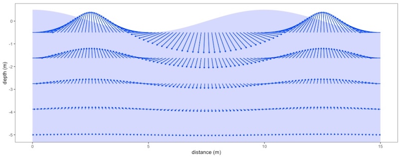 Notice that at the crest and trough, the water is only moving horizontally, whereas halfway up the wave slope, the movement is only vertical. And notice how for this 10 meter long wave, there’s almost no movement at water depths greater than 5 meters - i.e. half the wavelength.
