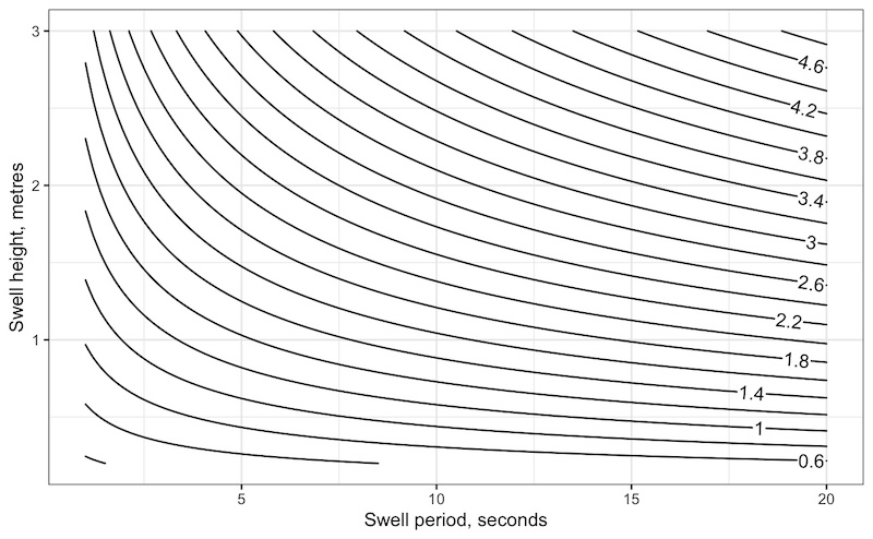 For example, if the swell height is 1 meter and the swell period is 15 seconds, we’d estimate the surf height at 1.8 meters.