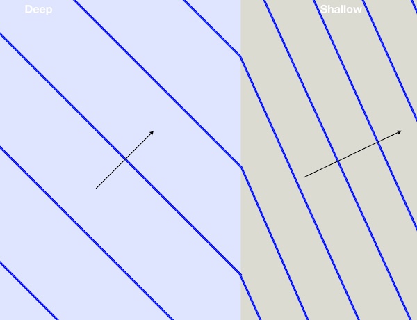 We know the wavelength of the waves before they enter the shallows, and it seems sensible that once they’re over the shallow areas they have the same wavelength as if they’d approached the shallow area head-on. And obviously, the wave crests need to line up over the step up into the shallows. The only way all this can be true is if the angle of the waves changes between deep and shallow water: