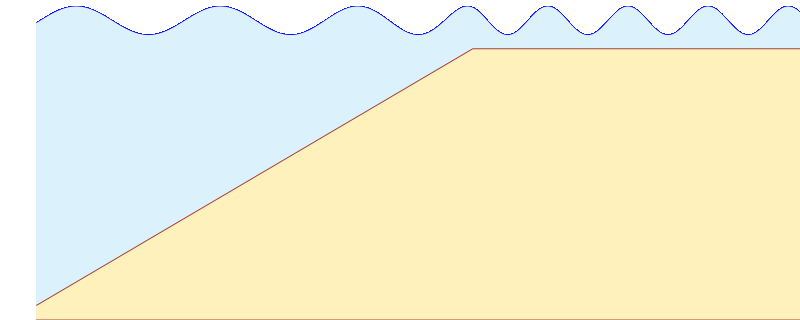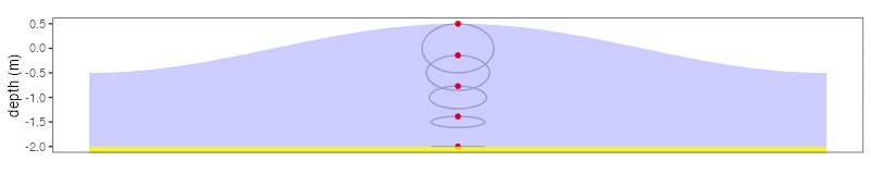 As the animation shows, the previously circular particle paths are now disrupted by the shallow bottom, becoming longer in the horizontal direction. The wave is now driving water forwards and backwards along the seabed, so it will start to lose energy much faster than it did in deep water.