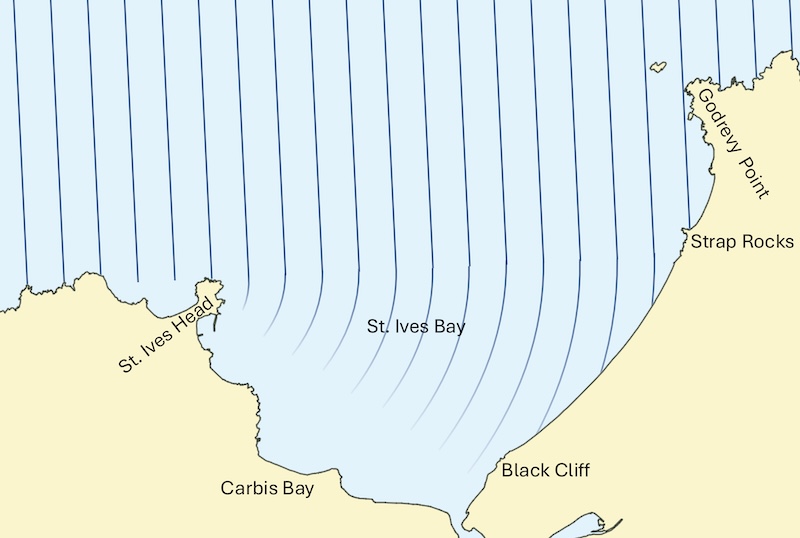 We might expect a swell pattern something like that sketched on the map above. The waves pass St.Ives Head and diffract into St.Ives Bay. We’d expect there to be some areas behind St. Ives Head that are almost completely sheltered - for example, around the harbour to the south of the Head. This shelter might extend down to Carbis Bay, although there may be some small waves here. A long beach extends from Carbis Bay almost as far as Godrevy Point. We’d expect the size of the waves to increase as we head north-east along this bay. By Black Cliff we’d expect some significant waves, with wave size increasing to around full height by Strap Rocks. Godrevy Point will likely have even larger waves due to refraction towards the headland (not shown on the map).