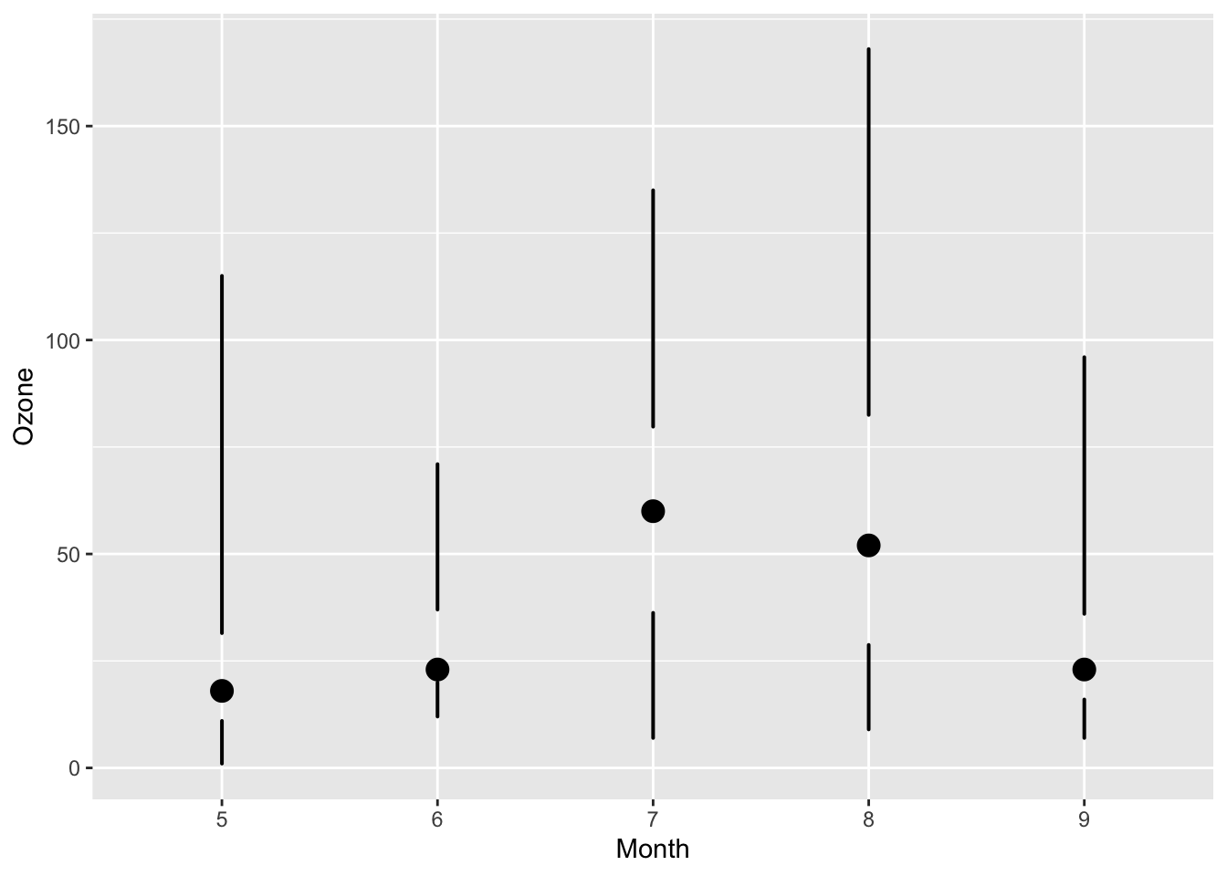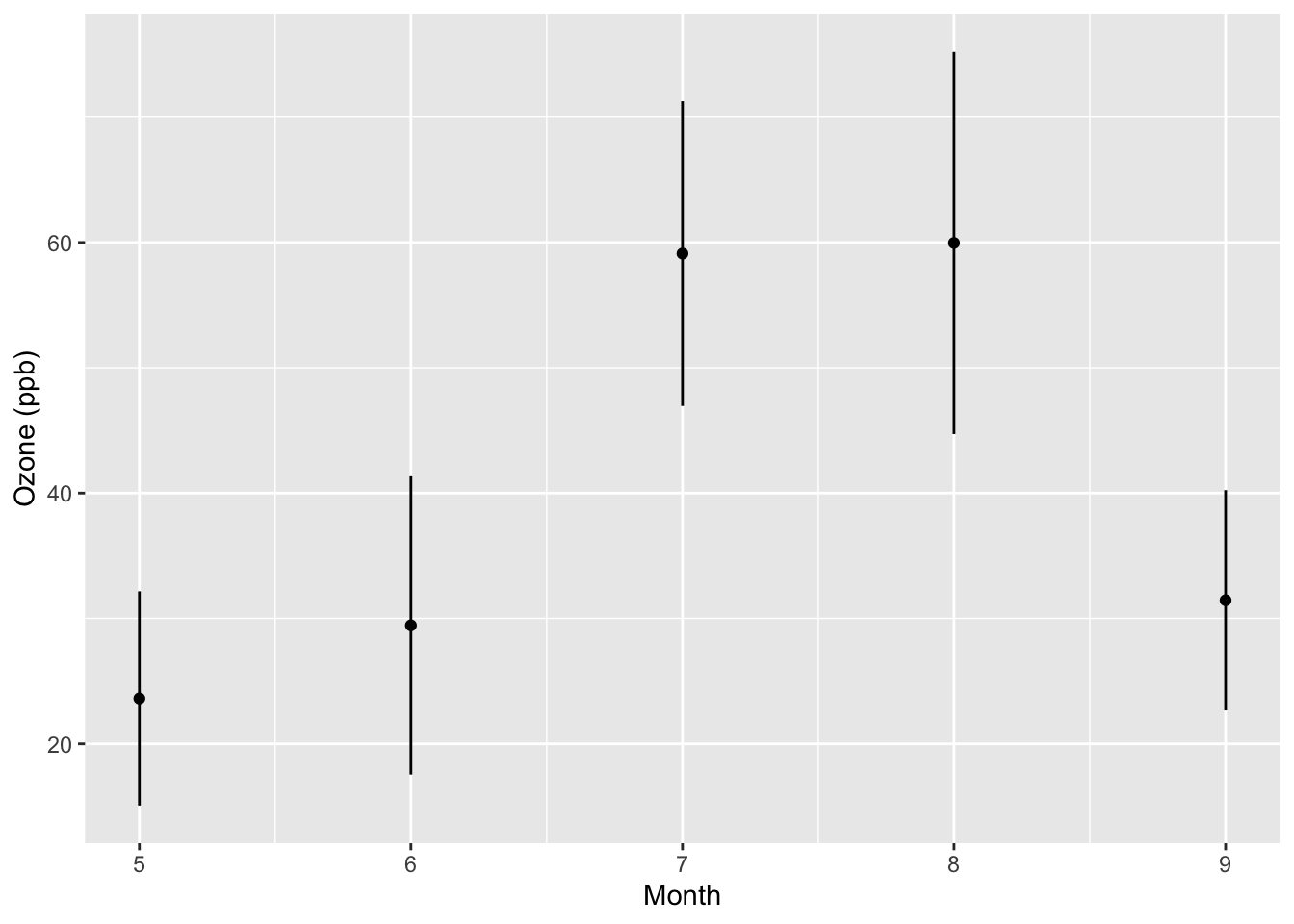 ggplot(data = monthly, aes(x = Month, y = ozone, stderr = stderr)) +